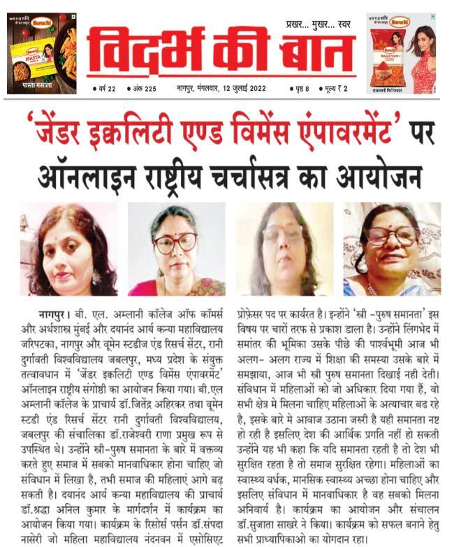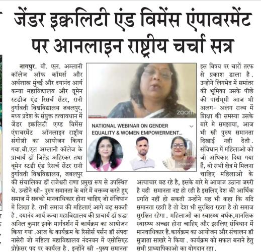 Collaboration with B.L.Amlani college of commerce and economics and Dayanand Arya Kanya Mahavidyalaya Jaripatka Nagpur and women studies and research centre Rani Durgavati University Jabalpur Madhya Pradesh resource person Dr sampada nursery and guest of owner Dr Shraddha Anil Kumar organised program by Dr Chetna Pathak and Dr.Sujata Sakhare